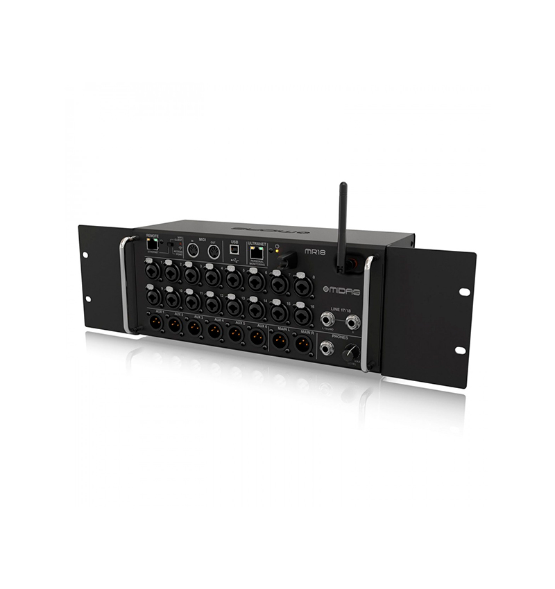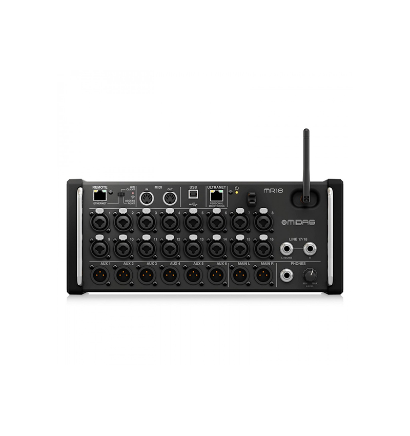 El mezclador digital MR18 cuenta con un conector USB que permite grabar y reproducir fácilmente archivos WAV estéreo sin comprimir. Ideal tanto para sesiones de estudio como para grabar actuaciones en directo, el Midas MR18 ofrece monitorización sin latencia al grabar hasta 18 señales fuente. Además, este mezclador permite enviar notas MIDI a su software DAW para grabación y edición.