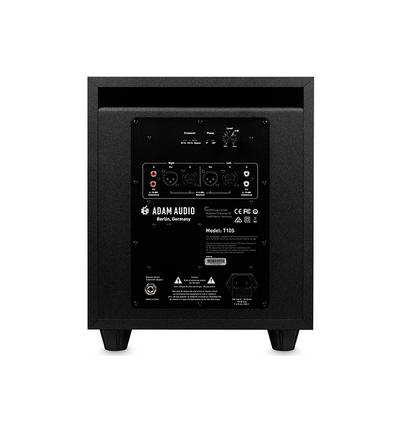 Equipado con un altavoz de graves de 10 pulgadas y un amplificador de Clase D de 130 W de potencia, la respuesta de frecuencia del T10S va desde los 28 Hz a los 120 Hz y ofrece un SPL máximo que alcanza unos impresionantes 104 dB. Un crossover interno ajustable de dos canales permite la calibración de la señal de bajos y proporciona un rendimiento óptimo del sistema total. Las opciones de ajuste en la parte posterior del subwoofer permiten una variedad de ajustes que nos permiten compensar la acústica de la sala y ofrecernos más control sobre los satélites conectados al mismo.
